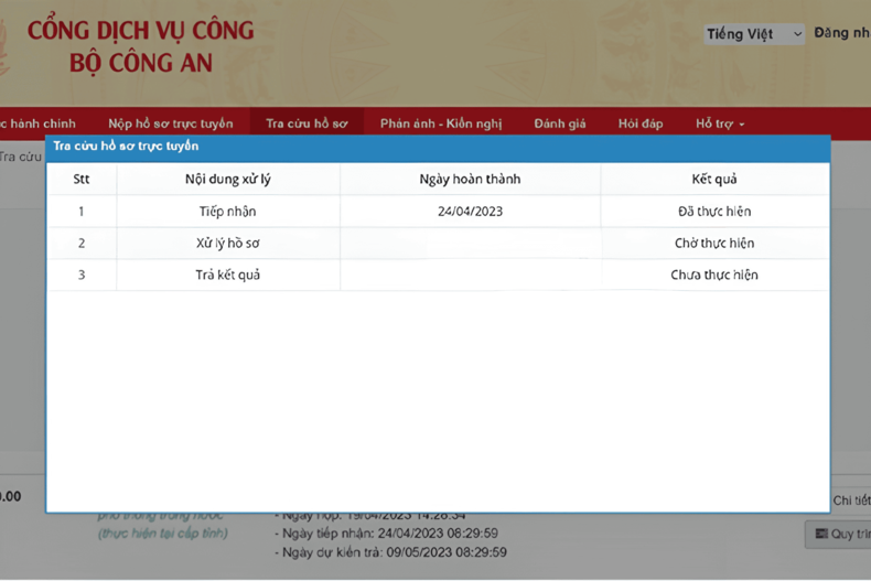 • Bước 4: Bấm “Tra cứu”. Hệ thống sẽ hiển thị một thanh tiến trình (Progress bar) cho biết hồ sơ của bạn đã hoàn thành được bao nhiêu phần trăm và đang nằm ở cơ quan nào giải quyết.