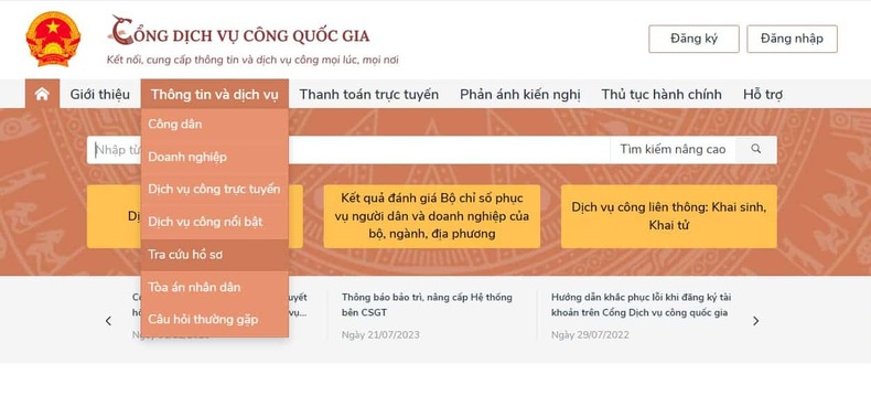 • Bước 2: Chọn mục “Tra cứu hồ sơ” trên thanh menu ở đầu trang web như hình trên.